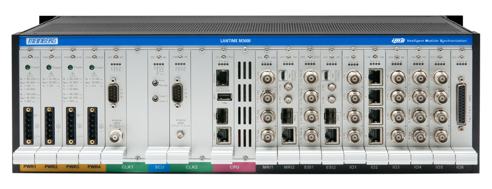 Come primo prodotto IMS il LANTIME M3000 propone 10 slot I/O. Mentre tutte queste slot possono essere opportunamente equipaggiate con moduli I/O IMS, le prime quattro possono essere utilizzate come addizionali moduli d’ingresso. Entrambi i moduli Clock possono essere espansi con una scheda MRI ( Multi Reference Input) ed una scheda ESI (External Reference Input) o addirittura con due schede ESI. Mentre la scheda MRI supporta le tipiche sorgenti MRS (i.e. 1 PPS, 10 MHz, DCLS e AM codici IRIG/AAFNOR/IEEE1344 C37.118) la scheda ESI supporta frequenze variabili ( 1KHz-10 MHz) [also frequency step should be specified here] così come i segnale E1 ed T1 delle telecomunicazioni. I segnali tramati E1/T1 sono opportunamente decodificati per supportare SSM/BOC e quindi trasferire ai moduli d’uscita (IMS-LIU) la corretta informazione circa lo stato del SSU. [ for TLC application you should state this device is precisely an SSU (Synchronisation Supply Unit)]